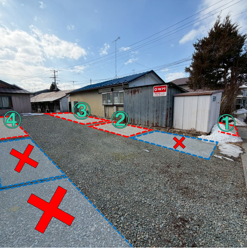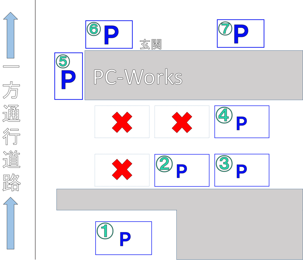 ご来店の際は駐車場No.①~④の空いているスペースをご利用下さいますよう、お願いいたします。