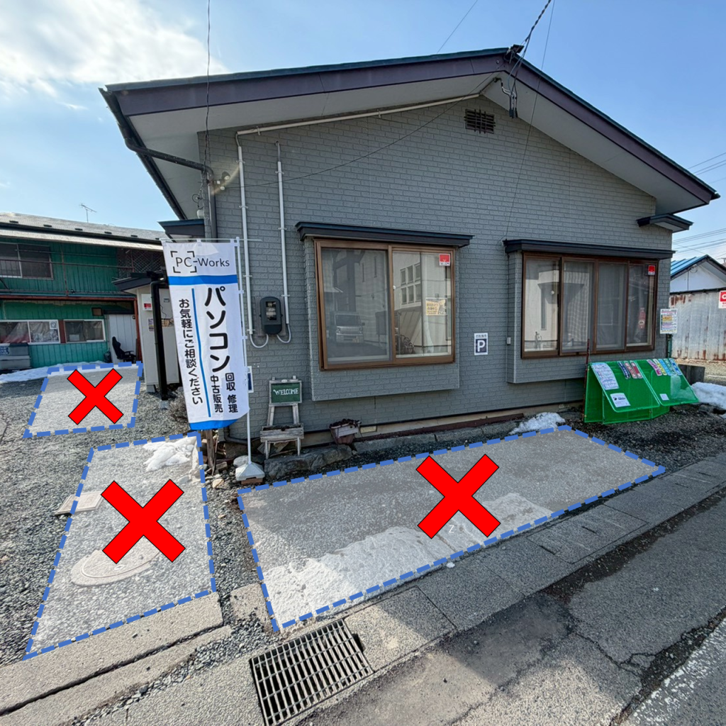 本日3月11日は近隣道路の舗装工事のため工事車両が入り、店舗前の駐車場No.⑤~⑦がご利用いただけません。